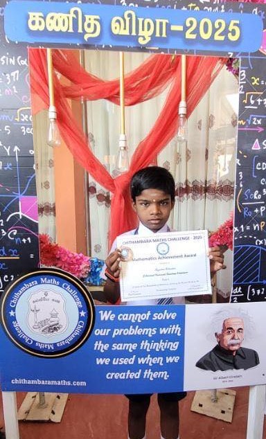 08.03.2025 உலகளாவிய ரீதியில் நடைபெற்ற சிதம்பரா கணிதப் போட்டியில் எமது பாடசாலையில் கல்வி கற்கும் தரம் 5 மாணவன் இ.கபீஷன் அவர்கள் தெரிவு செய்யப்பட்டு வெண்கலப் பதக்கத்தை பெற்றுக் கொண்டார். பாடசாலைக்கு பெருமை சேர்த்த இம் மாணவனை பாராட்டுவதுடன் இவருக்கு வழி காட்டிய வகுப்பு ஆசிரியர் திருமதி. கௌசலா ராஜ்குமார், ஆசிரியர் திரு.மூ. பாலேந்திரன் ஆகியோர்களுக்கு பாடசாலை சார்பாக நன்றிகளையும் தெரிவித்துக் கொள்கிறோம்.